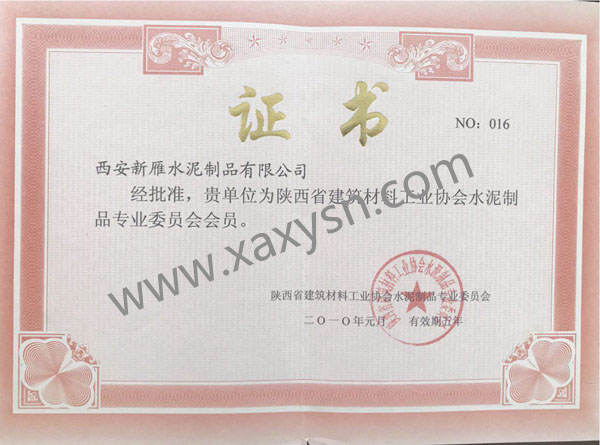 西安新雁水泥制品有限公司為陜西省建筑材料工業(yè)協(xié)會水泥制品專業(yè)委員會會員